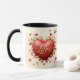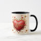 En romantisk och elegant Valentininspirerad design med ett fet rött hjärta i mitten med "Kärlek" skriven på ett vackert sätt inuti. Omringad av skuggande gyllene hjärtan i bakgrunden, de designade gnistor med gyllene beröring, skapande en varm och kärleksfull atmosfär. "Ursprunglig bild genererades av Meta AI. AI skapade teckningar. Licensierad enligt CC BY-SA 4.0."