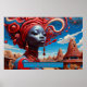 Denna slående teckning är en levande, surrealistisk bild av ett figur som blandar det traditionella afrikanska inslag med fetstik, futuristiska estetik. Det centrala figur är en kvinna med blåtonad hud, som ge nästan är eeral eller på annat sätt närvarande i världen. Hennes uttryck är fred, med stort, uttrycksfullt ögon och fullt läppar. Hennes hår är en explosion av abstrakter som liknar färgstarka moln och invecklade garvar, vilket antyder kreativitet, tanke eller kanske en krona-liknande symbol för visdom och fantasi. De livliga nyheterna - allt från nyp, blåsor, orangar och - gör att sammansättningen blir levande och framkallar en känsla av energi och styrka. Bakgrunden är en abstrakt byscen i Afrika, med moderniserade men rustiska hus som blandas med drömliknande, organiska former. Himmel övergår från ett lugnande blått till varmare toner, vilket ger en känsla av både fred och dynamik, som om scenen finns mellan två världar - kanske den verkliga och den inbillade, eller det förflutna och framtiden. Detta arbete verkar symbolisera sammanslagningen av det afrikanska arvet med en djärv framtidsvision. Kvinnans huvudduk och talesmän representerar traditionell afrikansk skönhet, medan det surreella färg och inslag pekar på den innovativa och uppfinningsrika andan. Bilden kan ses som en firande av afrikansk kultur, identitet och återhämtningsförmåga, uttryckt genom en blandning av tradition och framåtblickande kreativitet.
