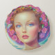 En spännande fantasi porträtt av en kvinna med en levande blomma krona och en glödande pastelltoner. Hennes ljusblå ögon och mjuka uttryck kompletteras av en känslig fjäril och en snurrande regnbåge. Denna drömliknande illustration blandar skönhet, natur och surrealistisk elegans.