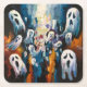 Bilden visar ett runt mönster med abstrakter som liknar spökliknande figurer i vitt med svarta och bruna accenter, vilket skapar en kaleidoskopisk effekt.