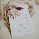Etheral och Burgundy Bohemian Bröllop Radiating a poetic mixend of nature's elegance, den här boho bröllopsinbjudan fångar med sin harmoniska palett av och burgiga nyanser. En förtjusande vit blomma går i centrum, mjukt inramad av ro i ömmande rosa och rikens burgiga löv. Utformningen höjs ytterligare med fjädrande botaniska ämnen, vilket ger en aning bohemisk nåd. Inställd mot en pristinvit bakgrund är namnen på bruden och trimmen grafiskt inskriven i ett romantiskt skript, där detaljerna i bröllop är ordentligt ordnade nedan. Denna inbjudan är en vacker inledning till ett hjärtligt bohemskt firande, som omfattar själva kärnan i kärlek och naturen.