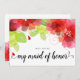 Röda blommor och kursivt skript stil handskrivet kalligrafi blommigt vår bröllop "Kommer du att vara min maid of honor?"-kort. Den här vackra designen visar röda blommor och rosa blommor med grönt löv.