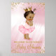 Etnisk prinsessa baby shower välkomstskylt med söt etnisk babyflicka som bär en snygg rosa tutu och pärlor på en rosa satin- och guldglittrig bakgrund. Denna afrikanska prinsessa baby shower välkomstskylt kan enkelt anpassas för ditt evenemang genom att helt enkelt lägga till dina detaljer. Du kan också ta bort satinbakgrunden och lägga till färgen du väljer.
