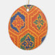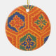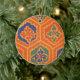 Ett runt prydnadsföremål med ett mönster av blommigt i orange, gyllene gult, terracotta, blått och grönt, från en skärmskrift av Judy Adamson.