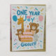 Kortets framsida har en levande, glad design med ett lekfullt och vismiskt tema. I mitten står parollen "Ett år av Joy och Giggles!" skriven i fet, lekfull skrift med en blandning av ljusa färger som blått, rosa och gult. Omkring texten finns vackra exempel på leende djur av tecknad, t.ex. en nalle, en kniv och en giraff, som var och en bär party hattar och omges av färgstarka ballonger och konetti. En söt, dekorerad kaka med ett enda stearinljus vid grund, med nummer "1" överst, som tillför en fin beröring.