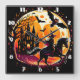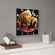 Ett dramatiskt halloween-häströ under ett helt mån fyrkantig klocka