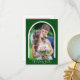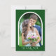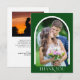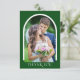Skicka dina gäster i bröllop det här enkla, moderna fototackkortet. Designen innehåller ett bågfoto på framsidan och ett andra rektangulärt foto på baksidan tillsammans med anpassningsbar för ett personligt meddelande. Bakgrunden är grönten.