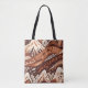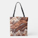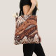 Ett färgstarkt abstrakt med stiliserade berg, backe och geometriskt mönster i nyanser av brunt, orange och vitt till väskan