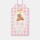 Fira din lilla en stor dag med denna söta presentkort till valp-fest! Med en söt golden doodle-valp med rosa rosett på en mjuk rosa gingham-bakgrund är detta kort den perfekta avslutande detaljen för en "Ett gyllene år" eller golden doodle-födelsedagsfest. Anpassa den med ditt barns namn och använd den till presentpåsar, gåvor eller som en charmig souvenir. Perfekt för föräldrar som planerar en valptematisk födelsedagsfest eller golden doodle-bebisfest för sin lilla flicka.