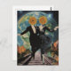 Ett sött par med blommor på huvudet dansar på järnvägsspår framför planeten Jorden surrealistisk fantasikonst