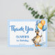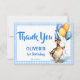 Ett lyckligt anka blue gingham 1:a födelsedag party tackkort, söt gräsänder anka med party hatt och ballonger med mjuka pastelblågingham gräns för pojkar 1:a födelsedag party tackkort