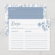Det här vackra receptet för möhippa av blått blommigt är perfekt för att hämta alla dina speciella recept. Med ett dammigt blått och vitt färg-schema och vackra accenter för blommigt är det här kortet säkert ett speciellt tryck på möhippan. dina favoritrecept med dina nära och kära och behålla ett uppskattat minne av din speciella dag.