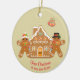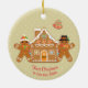 Ljusa och färgstarka Gingerbröd och gingerbröd par mot en gult och vit polka-punktbakgrund. Texten lyder "Första julen i vårt nya hem". Anpassa med året. Du kan också anpassa den mer genom att ändra den till Första jul tillsammans, eller i ny lägenhet osv.