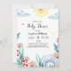Ett platta ljugit inbjudningskort för babydusch som innehåller vidhäftande vattenfärgsväxt bilder med mjuka pastel emerald och blå löv, grenar, regnbåge och mjuka rosa blommor.