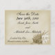 Ett vackert tropiskt temat bröllop spara datum-kort för alla lycklig par som planerar ett strandbröllop. Baksidan har "Kärlek" skriven i sanden, med ett hjärta som har en pil genom den nedanför. På framsidan finns ett meddelande om brudgummen och brudgummens namn med bröllop-datumet, som kan vara fullt personlig. I högernas handhörn är ett gyllene årstidshelvete.