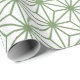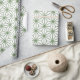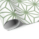 Ett sömlöst mönster av sammankopplade gröna geometriska former som bildar ett invecklat rutnät på en vit bakgrund och skapar en balanserad och harmonisk design.