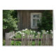 Ett foto som visar en lantlig trähut med fönster och en trädgård fullt av vit ros.