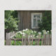 Ett foto som visar en lantlig trähut med fönster och en trädgård fullt av vit ros.