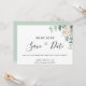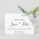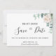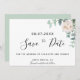 Ett modernt Spara datumkort för ett bröllop. En chic vit bakgrund som dekoreras med grönt vattenfärgad eukalyptus grey, löv och spriter och en vattenfärgad vit peony, blommans blommigt. Anpassa och lägg till namn, datum och ställe på platsen. Svart färgad brev. Texten: Spara datumet skrivs med ett stort trendig-handskript i stil.