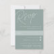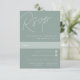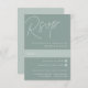 Designad för att matcha våra bröllopsinbjudningar i skript, är denna elegant typografibaserad OSA kort perfekt för traditionella RSVP-program för e-post. Utformningen har överdimensionerade skript som skrivs överst, i tonlägen på tonskuggor för en vattenstämpeleffekt. Anpassa till önskat datum och önskad anpassningsbar för att acceptera och avböja formuleringar i klassiska serif-bokstäver som är justerade vid den nedre högerna, tillsammans med val av måltid eller inmatningsmarkeringar. Vår Eucalyptus kolorway är en blandning av dammiga gröntar med elegant och blek grönt och vit text på en grönt.