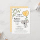 En koala björndusch inbjudan med en söt koala björn som flyter uppifrån genom en gyllene gult, hjärtformade ballong som hålls av en sträng av eukalyptus löv. Den här baby koala bär på en vit blyerts med en gult blöjstift på den. En vit och blek gult-polka punkt mönster på framsidan och en lätt gult-polka punkt mönster på baksidan. Ett mamma att vara vem som är redot att stoppa kommer att göra kärlek dessa eukalyptus träd gren inbjudningar till en babydusch i pojke eller en könsneutral babydusch i party. Art © Chrissy H. Studios, LLC. Alla höger reserverade.
