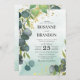 Dreamy romantiska bröllopsinbjudningar med en rustiskt blekt vattenfärg tvättat ut bakgrunden, elegant grönt botaniskt löv, stänk av faux guld foil och en enkel bröllop-mall som är enkel att anpassa.