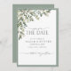 Skapa kortet perfekt bröllop spara datum med den här söten, moderna designen med vattenfärgad eukalyptus botaniska grey och handskrivna manustypografi. Kontaktdesigner för matchande produkter. Inbjudningskort för Elegant av upphovsrätt, alla höger reserverade.