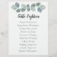 Botaniskt eukalyptus bröllop bordsnummer lakan av papprare med namn. grönten blek papper - som visas här på den tjockaste 17,5-vikten, i största storlek - har fet, blått-grönt-skript överst för bordsnumret och en lista med namn tryckt nedanför. Båda typsnitt är moderna och har ett handskrivet utseende. Kombinera namn vid behov eller lämna utrymmen. Naturtemat kommer att fungera för många bröllop-typer, inklusive rustik och utomhusbruk. Håll en bakgrund av något slag för att matcha ditt bröllop-tema för ett enkelt sätt att hjälpa gästerna att hitta bord. Omvänd är tomt. Om det behövs större papper överför du den här designen till en poster eller 8 x 11-tums papper.