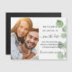 Ett modernt foto och ett foto med elegant Spara datumkortet. En chic vit bakgrund som dekorerats med eukalyptus greenery. Anpassa och lägg till foton och detaljer.