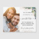 Ett modernt foto och ett foto med elegant Spara datumkortet. En chic vit bakgrund som dekorerats med eukalyptus grenery, gyllene blad och gnistor. Anpassa och lägg till foton och detaljer.