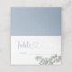 Våra bröllop-bord-kort i mjuk, dammblått med ömtålig eucalyptus-blomning ger en luft av finstig elegans till din mottagning. De här bord-korten fungerar inte bara. De är ett konstverk som tillför firande en aning naturskönhet och lugn.