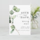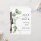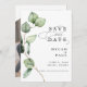 Det här vackra Spara datumkortet har en drömmande vattenfärgsspirg av eukalyptus, personlig med dina detaljer och bild Ett klassiskt serif-teckensnitt accentueras av exklusivens elegant calligraphy.. Perfekt till din boho, trädgård eller Greenery themed bröllop.