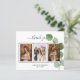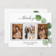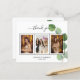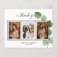 Lägg till 3 av dina födelsedagsfoton, lodrät storlekt, ett datum, namn och tackkortet. En chic vit bakgrund med svart text och ram, en eukalyptus sprig. Texten: Tack på framsidan och ditt namn på baksidan skrivs med ett handskript med snyggt med dekortecken.