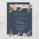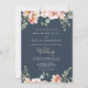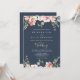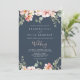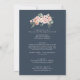 Den här eukalyptus-trädgården ro blommigt fram och bak-bröllopsinbjudan är perfekt för ett bröllop. Utformningen har blommor av rosa, , gult och ro med eukalyptus löv i en mörk marin blå bakgrund. Spara papper genom att på baksidan av inbjudan ange mer information i stället för på ett separat visitkort.