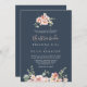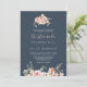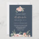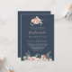 Den här inbjudan till bröllopsboda i ro-blommigten på eukalyptus är perfekt för ett bröllop. Utformningen har rosa, blommor, gul ros med eukalyptus löv i en mörk marin blå bakgrund.