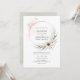 Bröllopinbjudan med anemonblommor och eukalyptus löv i ett koppargeometriskt ram.