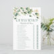 Den här vackra, moderna eukalypturen med guld Gissa Vem? möhippa-matchen lakan är perfekt för varje dusch. Den här roligten och det enkla spelet kommer säkert att föra med sig mycket skratt till vilken möhippa som helst! Det kommer definitivt att bryta isen och få alla att prata och skratta. Bara ge per lakan till varje gäst (glöm inte pennorna) och låt roligten börja! Du blir förvånad över hur många som känner till svaren. Om du vill göra den här möhippan till ett eget spel väljer du Anpassa den här mallen och skriver in den i namn och namn i brudgummen.