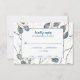 Enkelt och snyggt, det här är den perfekt OSA kort att skicka till alla era framtida gäster i bröllop. Utformningen har handmålad blå vattenfärg eucalyptus grenar med guld löv i bakgrunden. En vit med blå gräns-ruta omger svarstexten som är helt anpassade. Baksidan har en blå bakgrund med guld blad.
