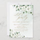 Modern chic vattenfärgsvit blommigt eucalyptus grey och guld färg-trendiget "låt oss party" på dammig grönt bakgrund, med pars monogram på rygg, elegant och snyggt, underbar för rustik botanisk bröllopsfest, förlovningsfest, vow förnyelse party eller andra fiendeevenemang. Visa alla matchande delar i samlingen