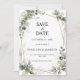Elegant och modern vår/midsommar sparar datumkortet med en bukett av mjuk vattenfärgsgrön lush grönt löv/botaniskt löv/eukalyptus och guld geometriskt ram. Hitta fler matchande utformningar och varianter från min butik. Och kontakta mig gärna för ytterligare anpassning eller matchning av objekt.