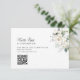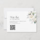 Ett QR-kort för OSA bröllop med enkel svart skrift, eucalyptus foliage och vita blommor.