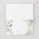 Det moderna bröllop-vikta platskortet med eukalyptus löv och grönenergi runt ett faux guld geometriskt ram, över en pastellfärgad tvätta. Insidan är en matchande skugga av mjuk blå grönt. Den här eleganten är den sterila utformningen underbar för ett botaniskt temat bröllop under sommaren.
