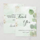 Ett tack för en 50-årsdag (eller vilken ålder som helst). En grönt vattenfärgad bakgrund som dekoreras med eucalyptus greenery och faux guld glitter stoft. På framsidan skriver stora svarta färgader skript och text: Tack, text, rubrik och datum. Tillbaka: Anpassa och lägg till tackkort och namn.