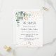 En vit chic bakgrund. Dekorerad med grönt vattenfärgade eukalyptus löv, sprit, grönsak och faux guld sprig. Golden hjärtan sprinklar. Anpassa och lägg till information om namn och ceremonier. Black brev.