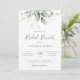 Snygg brunch-inbjudan från möhippa med vattenfärgad eukalyptus och guld löv med modern handskriven kalligrafi.