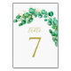 bordsnumret i bröllop har elegant guld typografi och en matris av strålande accent-vattenfärgen eukalyptus fylld med grönenergi, guld löv, grenar och spektrum av guld.