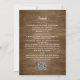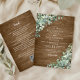 Bouqueterna med vattenfärg eucalyptus greenery dekorerar landsbyggsbröllopet av rustiskt trä i en enda inbjudan, med texten i modern elegant typsnitt, och bakgrunden till rustiskt trä. På baksidan finns detaljerna i bröllop med QR-kod och webbplats.