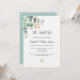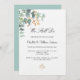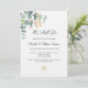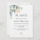 En vit chic bakgrund. Dekorerad med grönt vattenfärgade eukalyptus löv, sprit, grönsak och faux guld sprig. Anpassa och lägg till information om namn och ceremonier. Black brev. Bakåt: Skadlig bakgrund till grönten.