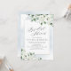 Modern vattenfärgsvit blommigt eukalyptus grey och trendigets "möhippa"-skript på dammig blå bakgrund, med pars monogram på rygg, elegant och snyggt, underbart inbjudningskort för möhippa för det sterila chic, botaniska bröllop och strandbröllop. Visa alla matchande delar i samlingen