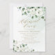Modern chic vattenfärgsvit blommigt eucalyptus grey och trendiget guld färg "rehearsal middag" skript på dammig grönt bakgrund, med pars monogram på rygg, elegant och snyggt, underbara middagsinbjudningar för rustiska bröllop, botaniska bröllop och badbröllop på strand. Visa alla matchande delar i samlingen